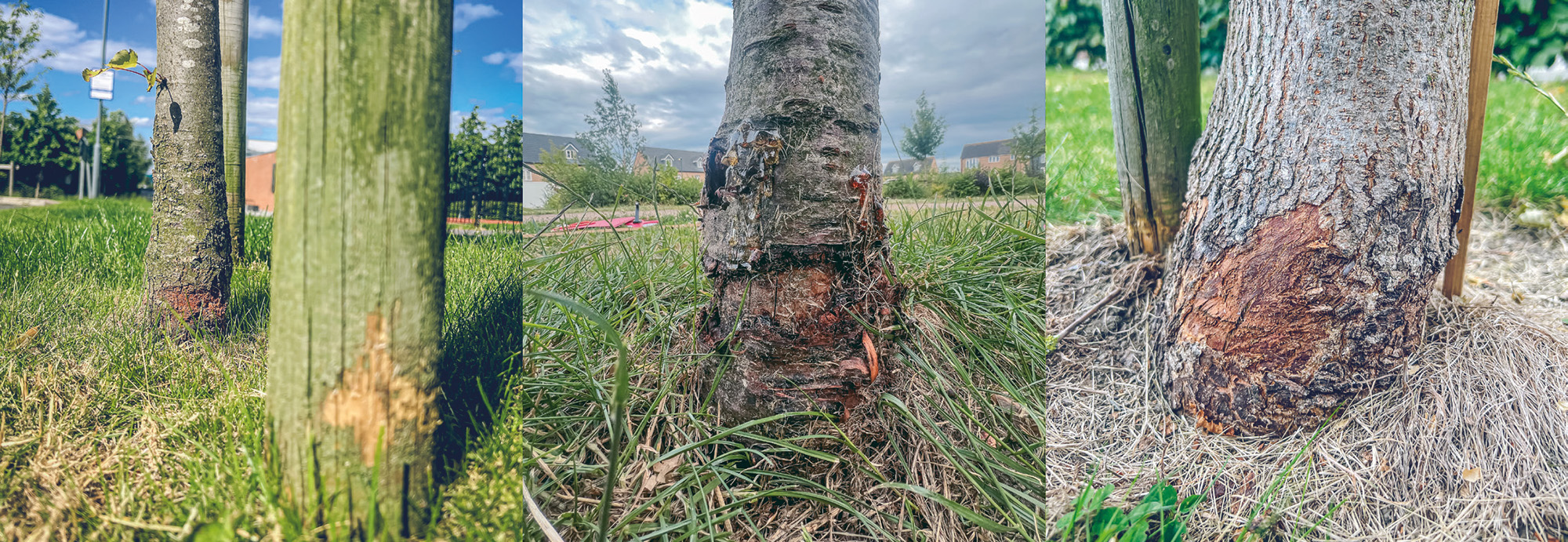 1. Strimmer damage is common in areas where grass is maintained.
