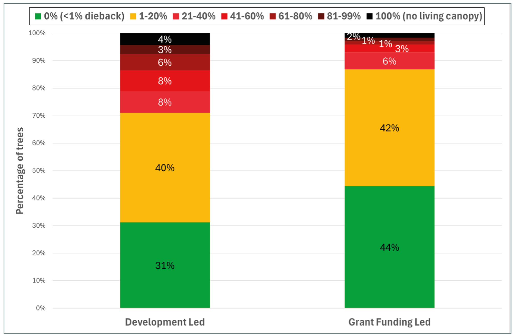 Figure 2. Crown dieback (total observation n=547; 304 development-led, 243 grant-funding-led).